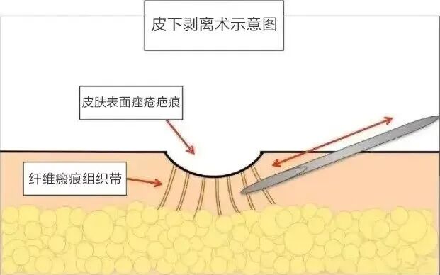 通过使用精细的器械,分离瘢痕与周围组织的粘连,破坏异常的纤维牵拉,刺激局部产生新的胶原蛋白和纤维组织去填充凹陷部位,使皮肤表面逐渐恢复平整。