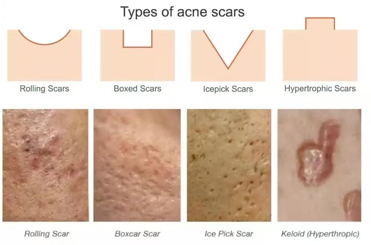痤疮瘢痕按照其形态不同可分为萎缩性、增生性及瘢痕疙瘩,其中萎缩性瘢痕占比80%。萎缩性痤疮瘢痕根据破坏深度和大小又分为冰锥型、箱车型和滚轮型。